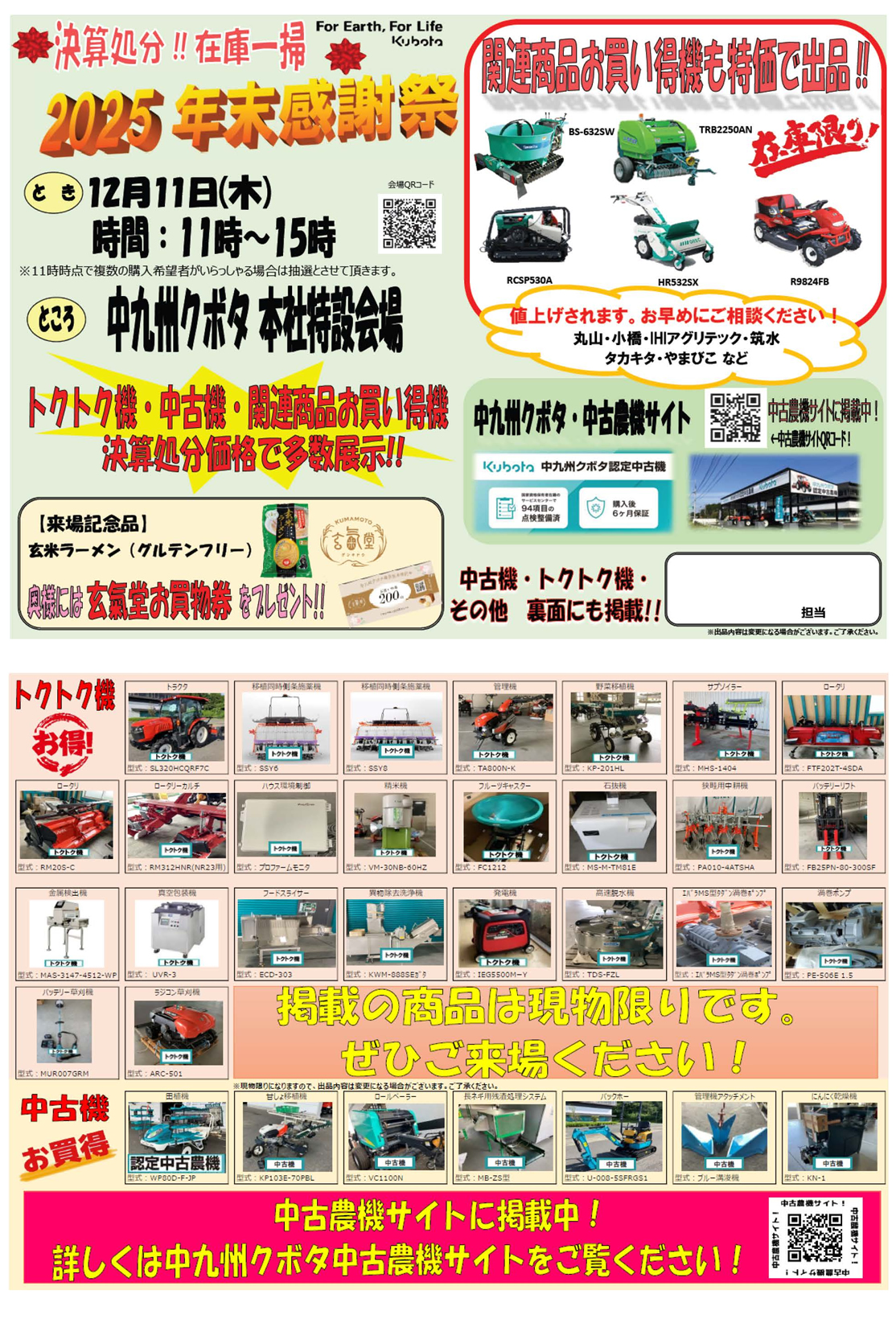 この度、中九州クボタ本社特設会場にて「2025年末感謝祭展示会」を開催いたします。